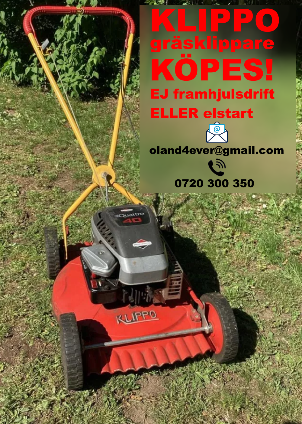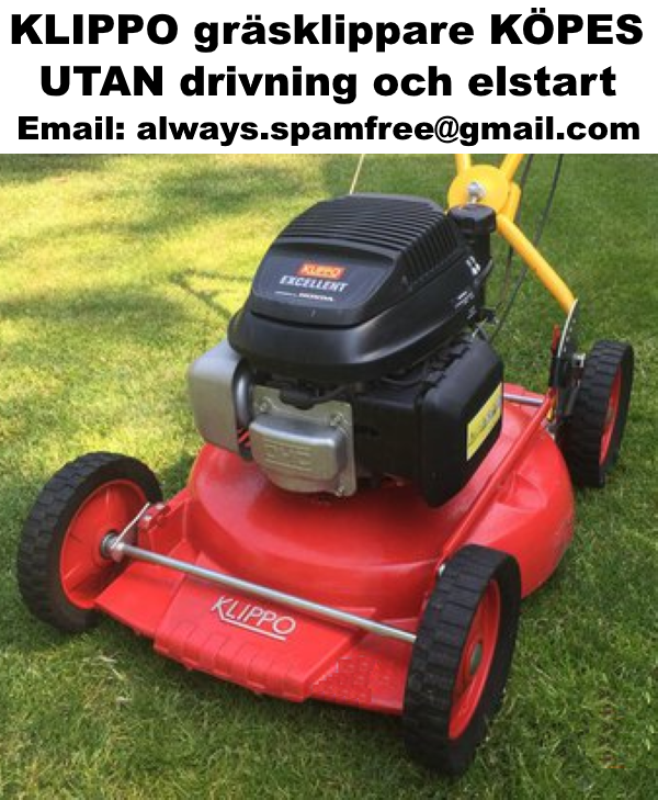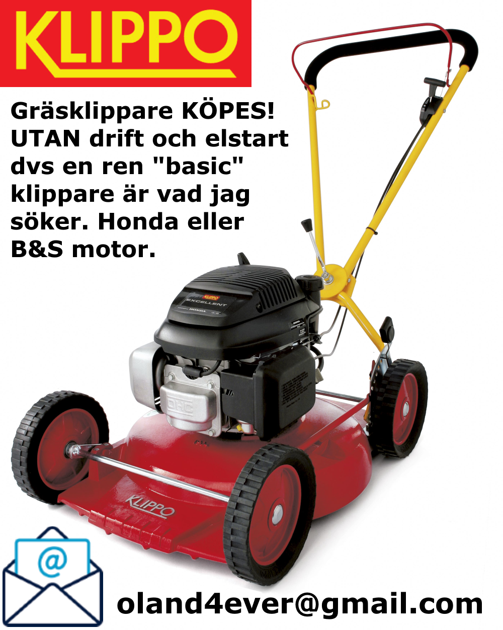 Om den har Briggs & Strattonmotor eller Hondamotor har inte så stor betydelse. Eftersom fler och fler går över till robotgräsklippare, och de som har lite större gräsytor att klippa satsar på åkgräsklippare, så borde det rimligen snart bli ett överskott av gamla bensindrivna gräsklippare. Maila mig eller slå mig en signal om du har något som du tror skulle intressera mig. Öland och Kalmar med omnejd (15 mils radie från Kalmar).